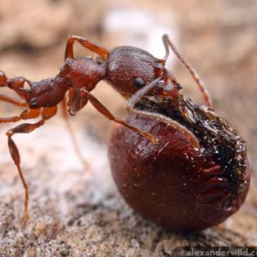 Leaf-litter ants like acorn ants (Temnothorax curvispinosus) create shallow nests in hollowed out tree nuts or under decaying logs. As such, they overwinter above-ground. In collaboration with the Londraville microbiology lab at UA, we study the ecological and physiological mechanisms underlying leaf litter ant overwintering under the combined pressures of climate change and urbanization. (Photo credit: Alex Wild)